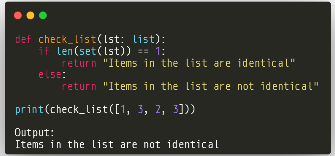In this code, since we have passed a list with identical elements as an argument, the function returns "Items in the list are identical."