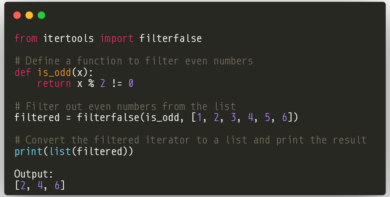 In this code, we use filterfalse() to return a list of even numbers. The filterfalse() function applies the is_odd function to each number in the list. It keeps only the numbers that do not meet the condition (i.e., numbers that are not odd). As a result, we get an iterator containing only the even numbers.