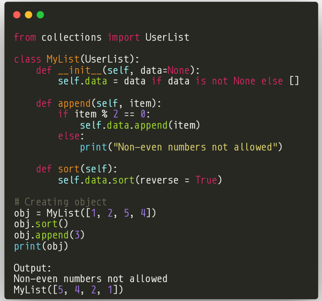 In this code, the append() method is overridden to allow only even numbers to be added to the list. If an odd number is passed, it prints a message indicating that non-even numbers are not allowed. The sort() method is also overridden to always sort the list in reverse order. When the obj instance is called with the argument 3, which is an odd number, the message "Non-even numbers not allowed" is printed, and the list remains unchanged.