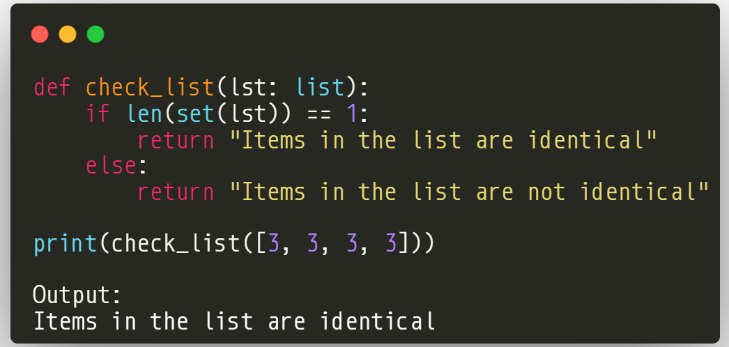 Do you know that you can use the set() function to check if all the items in a list are identical? Given a list, the set() function will convert the list into a set. This will automatically remove all duplicates from the list. If the length of the resulting set is 1, it means all items in the list are identical. Here is an example: