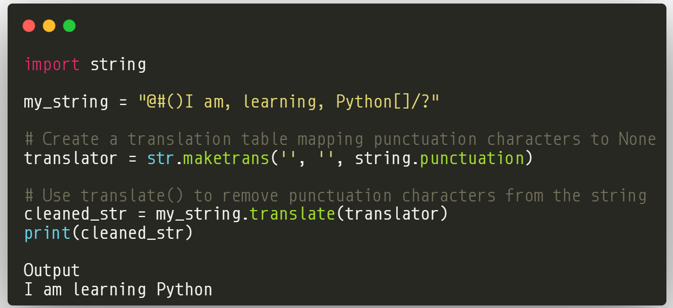 In this code, we have a string containing punctuation characters at the beginning, inside, and end. To remove them, we use the translate() method along with str.maketrans(), which creates a translation table mapping all punctuation characters to None. Passing this translator to translate() removes all unwanted characters, leaving us with a clean string.