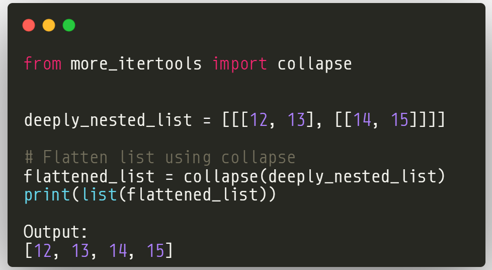 This code uses the collapse() function from the more_itertools module to flatten a deeply nested list. The output is a flattened list: [12, 13, 14, 15]. Additionally, collapse() offers the flexibility to specify the level of flattening, allowing you to control how much of the original nested structure is preserved.