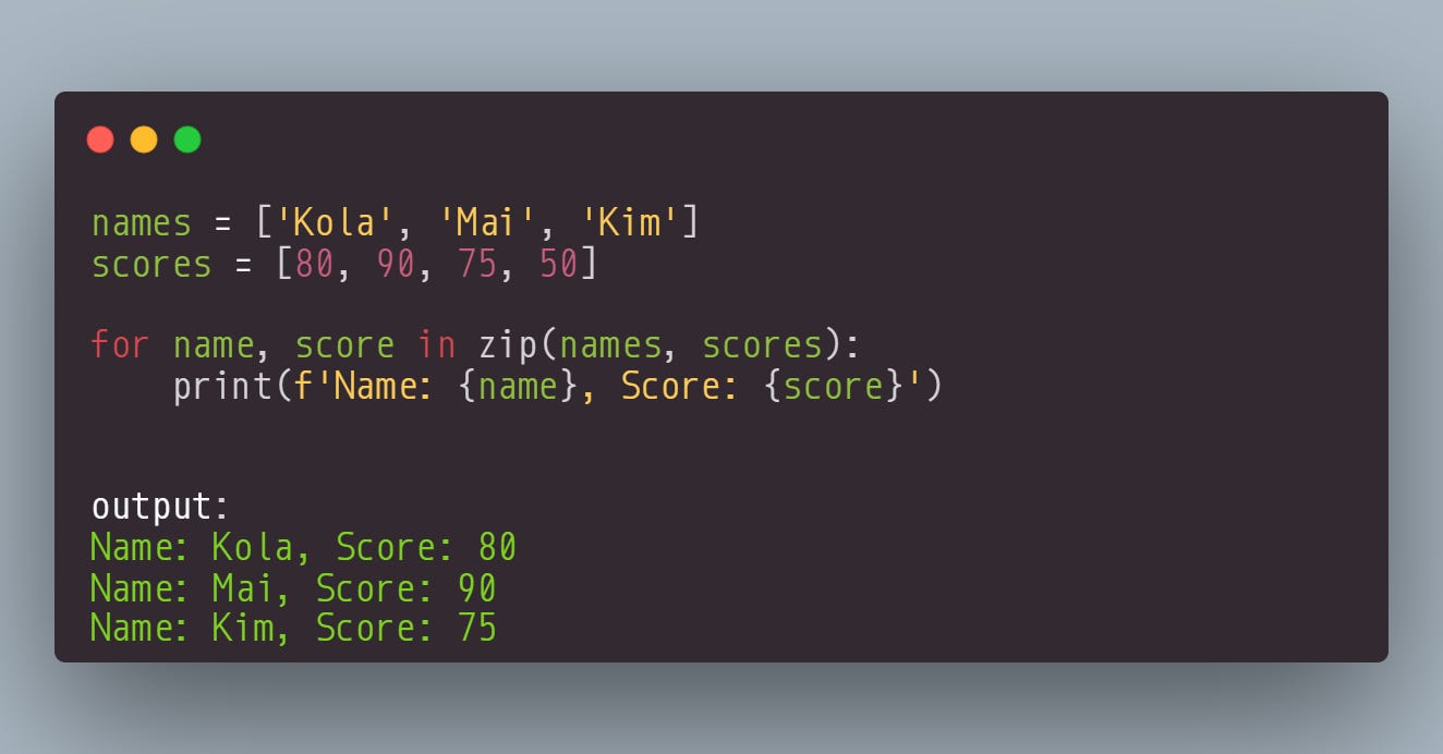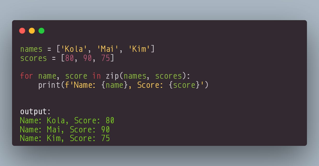 One thing that I love about Python is that there are always multiple ways to tackle a task. If you have multiple iterables and you want to iterate over them at the same time, there are several ways that you can do it. One of those ways is using the zip() function. The zip() function combines multiple iterables element-wise and returns an iterator of tuples. You can then unpack these tuples while iterating. Let's see an example. We have two lists: one for names and the other for scores. We want to iterate over the two lists. Here is how we do it with the zip() function: