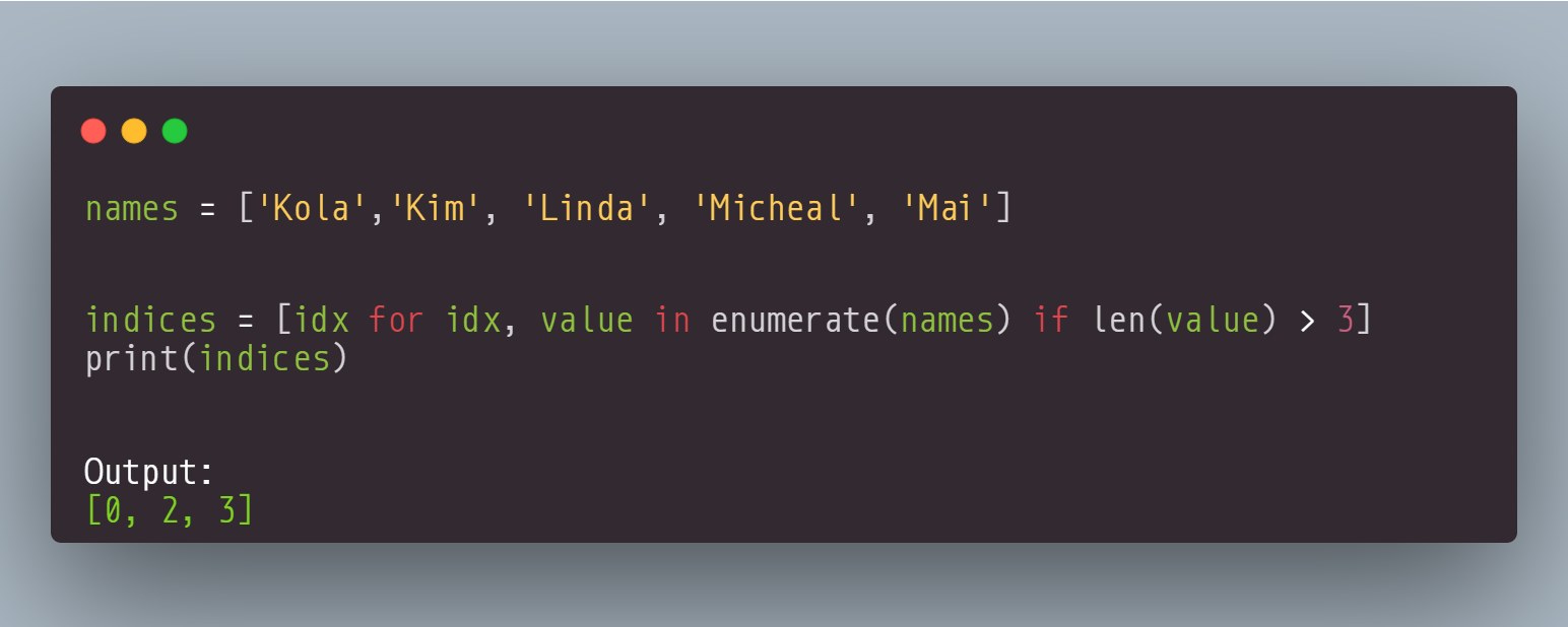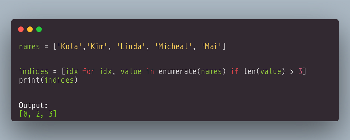 In this example, the enumerate function returns a tuple of the index and the corresponding value for each element in the numbers list. The list comprehension filters the elements based on the length (len(value) > 3). This returns a list of indices of all the names in the list that have a length greater than 3.