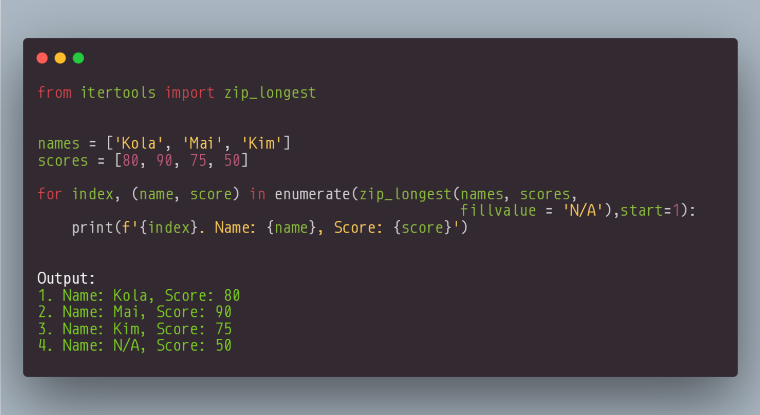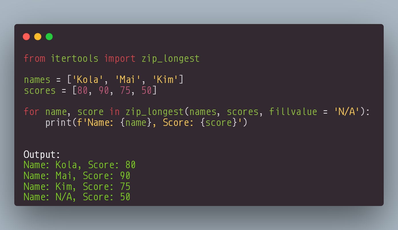 You can see here that the 50 in the scores list has been left out of the output. To overcome this limitation, we can use another cool Python function from the itertools library. This function is called zip_longest. Unlike the zip() function that stops when the shortest iterable is exhausted, the zip_longest will only stop if the longest iterable is exhausted. It fills in the missing values with a specified fill value (the default is None). In the example below, we want the missing values to be filled with "N/A." See below: