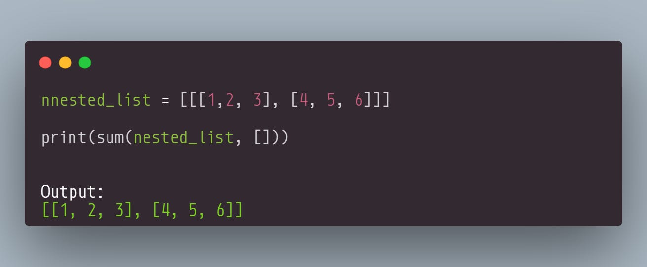 Look, we have flattened a 2-dimensional list using the sum() function successfully. But what happens when we have a deeply nested list? Can this approach work? Let's see another example: