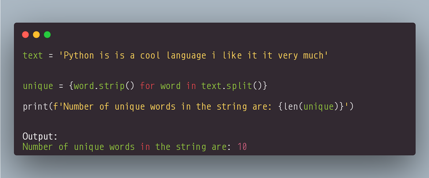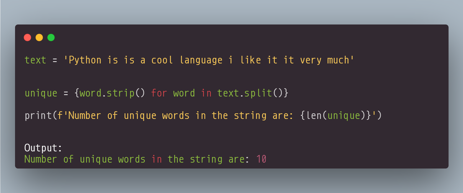 Sets do not allow duplicates. This makes them perfect for tasks that require removing duplicates. If you have a string and want to know how many unique words are there, you can use set comprehension with strip() and split() methods. Here is an example: