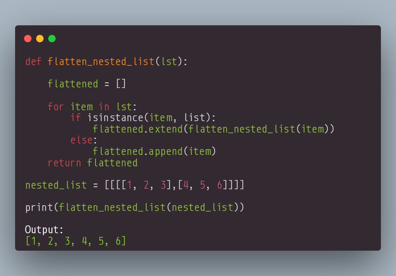 This function recursively calls itself for each element of the list. This allows it to handle nested lists of any depth. You can see here that a deeply nested list has been flattened. If you have a deeply nested list to process, you now know a cool tool to use: the recursive function.