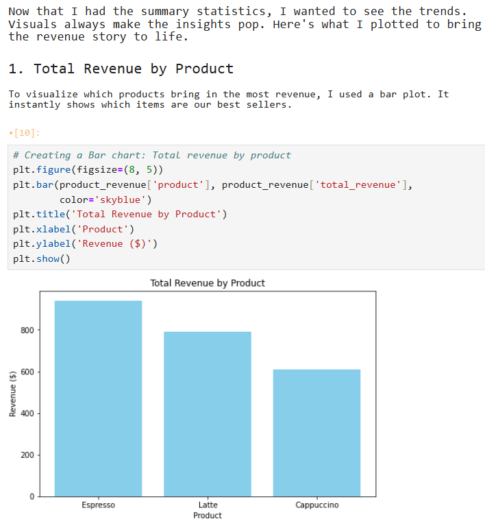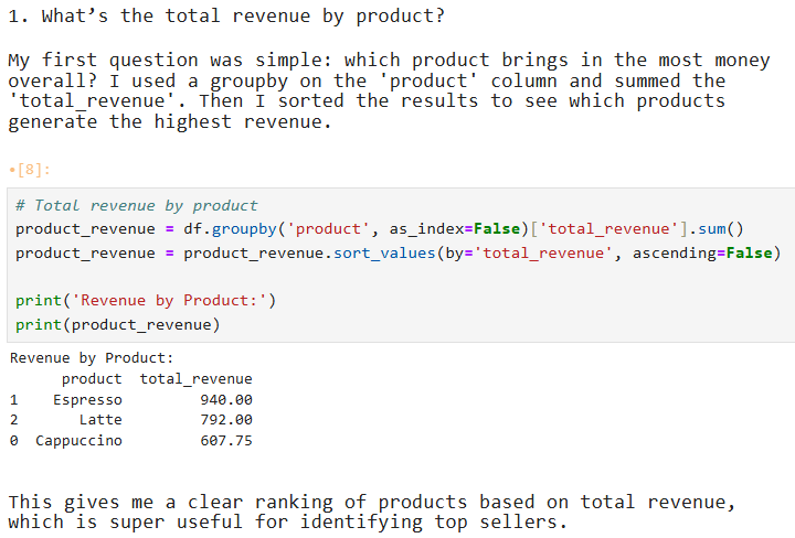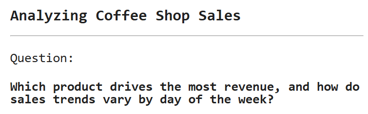 For our coffee shop dataset, let’s ask, “Which product drives the most revenue, and how do sales trends vary by day of the week?” This question helps the shop owner decide which drinks to promote and when to adjust staffing or inventory. It’s important to write the question prominently in your notebook or project to stay focused. See below: