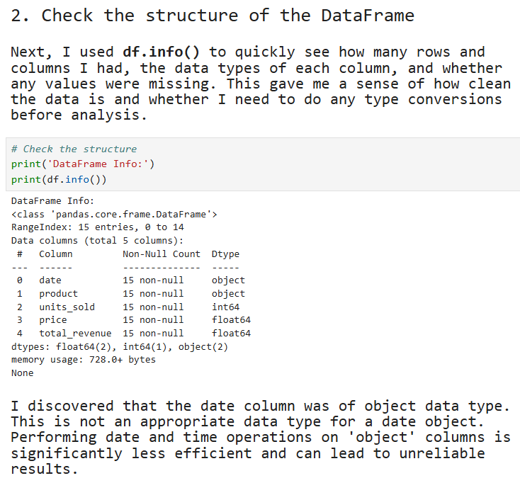This is also a crucial step in your project. You are going beyond simply viewing the first five rows of data. By checking the structure of the DataFrame, you are demonstrating that you understand the importance of assessing the state of the data before performing any analysis. Knowing the data types and spotting issues early helps you avoid errors and ensures that your analysis is based on reliable information.