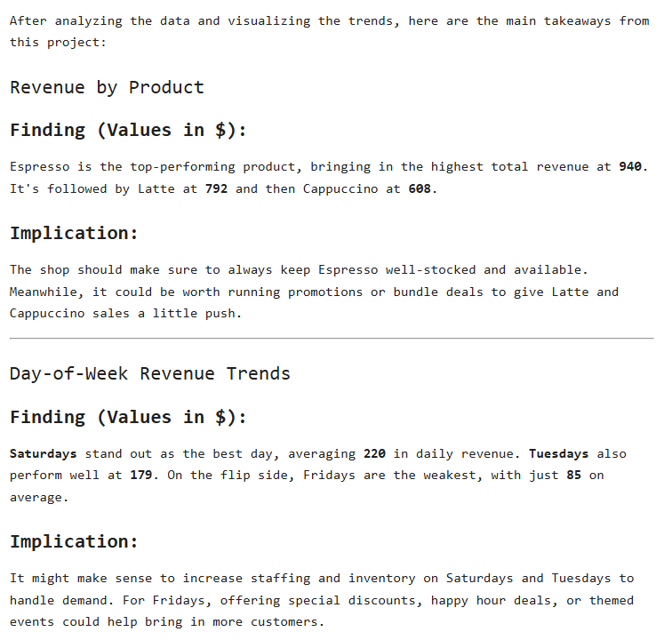 Revenue by Product: Finding: Espresso generates the highest revenue ($940), followed by latte ($792) and cappuccino ($608). Implication: The shop should prioritize espresso inventory and consider promotions to boost espresso and cappuccino sales.
