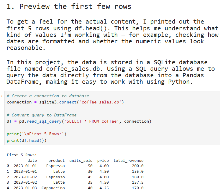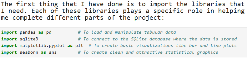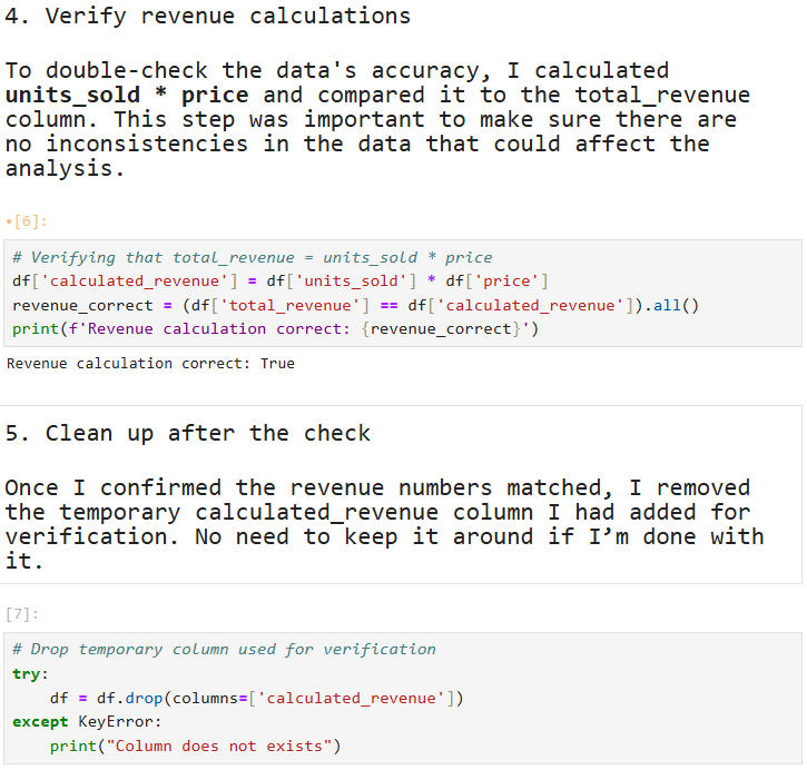 As a general rule, always assume your report will be read by someone unfamiliar with the tools or dataset. Every step should be explained clearly to make the project easy to follow. Here is how it is documented in the notebook: