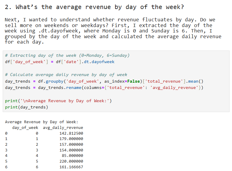 Now that we have a good understanding of revenue per product, we can take our analysis further by examining how revenue varies by the day of the week. This step will help us identify any patterns in sales trends, such as whether the shop performs better on weekends or if there are particular days when sales are lower. See below: