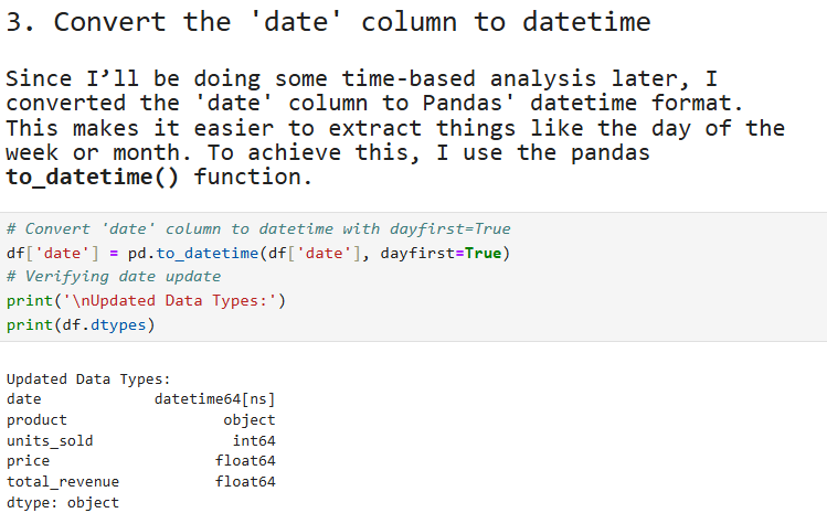 The next step is to convert the ‘date’ column to datetime format using Pandas. This is important because the column is currently stored as an object data type, which means the values are being treated as plain text rather than actual dates.