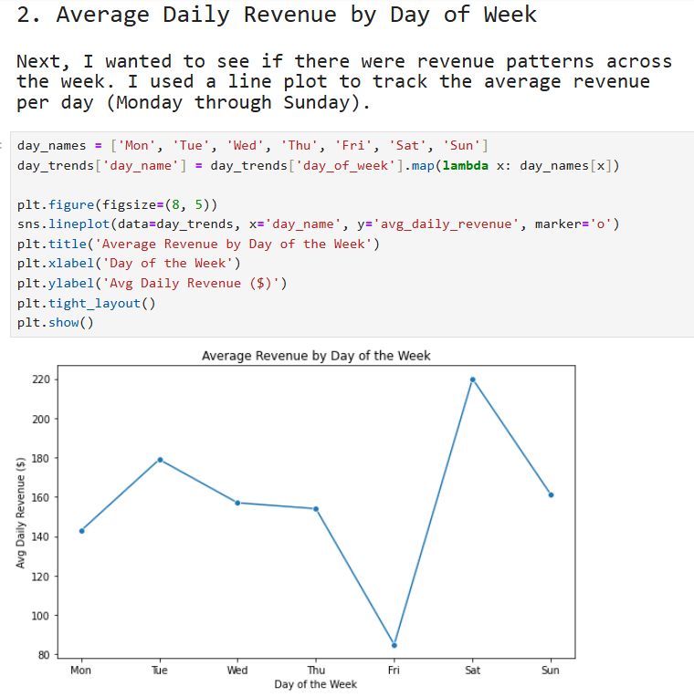Day-of-Week Trends: Finding: Saturdays (avg. $220 daily revenue) and Tuesdays ($179) are the strongest days, while Fridays ($85) are the weakest. Implication: Increase staffing on weekends and explore discounts or events on Mondays to lift sales.
