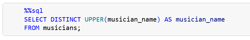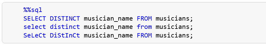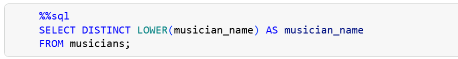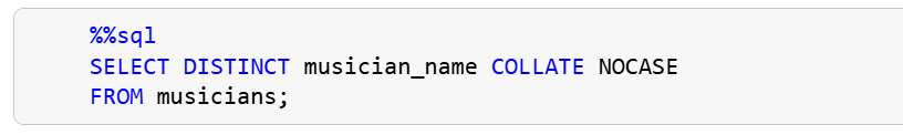 In SQLite, the default collation rules for the DISTINCT clause treat ‘Ed Sheeran’ and ‘ed sheeran’ as unique values because of the different cases. To fix this, we need to standardize the case before applying DISTINCT. One simple method is to use the LOWER() or UPPER() functions on the musician_name column before applying DISTINCT. See below: