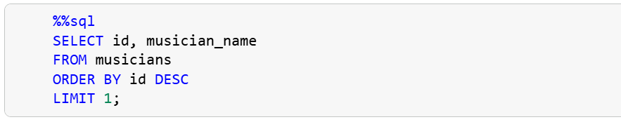 2. You want to view the last row of the musician_name column and its ID. How do you write the query?