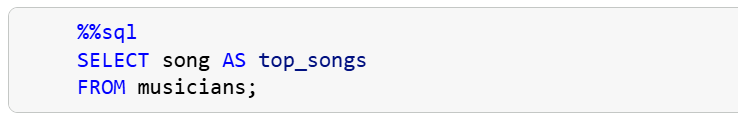 This question is very straightforward. All you need to do is pass the song column to the SELECT clause. However, it introduces a very important concept in SQL: aliases.