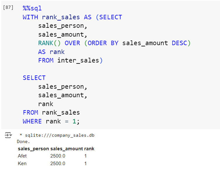 Here, because we are using the RANK() function, the top-selling persons have been assigned the same rank. So we are able to retrieve both names. If we had used the ROW_NUMBER() function, then only one name would have been retrieved because the two top people would have been assigned different ranks even though they have achieved the same sales amount.