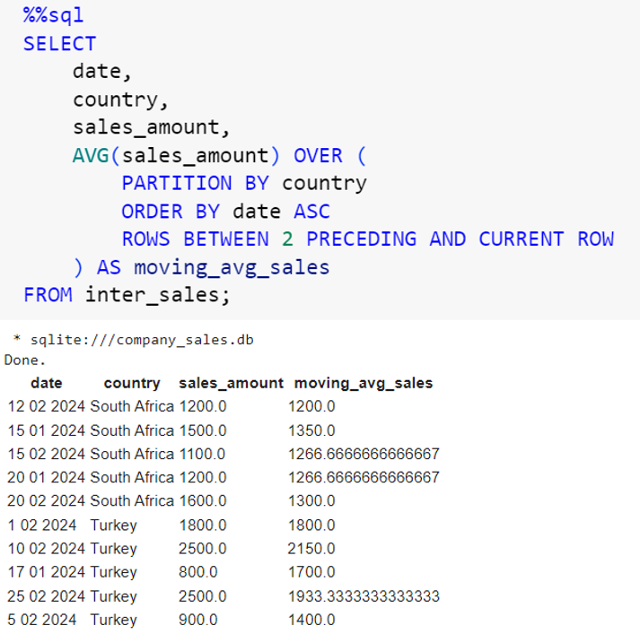 We can also calculate a moving average over a specified number of rows using window frames. For example, we can calculate a 3-day moving average of sales for each country by defining a 3-day window frame. See below: