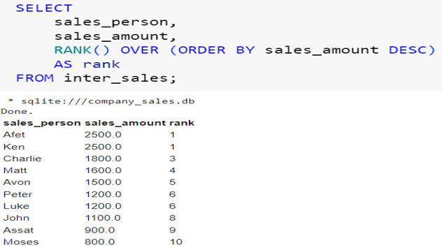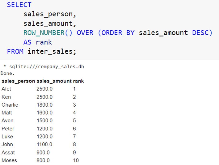 The ROW_NUMBER() function assigns a sequential number to each row based on the sales values. It will assign the person with the highest amount a rank of 1 and the next person a rank of 2, just like that. You can see the ranking in the rank column. Notice that Afet and Ken both achieved a sales amount of 2500 (which is a tie), and they have been given a rank of 1 and 2 even though the sales amount is equal. This is because of the behavior of the ROW_NUMBER function. This function will assign consecutive numbers, even if there are ties