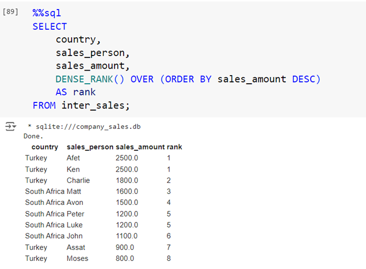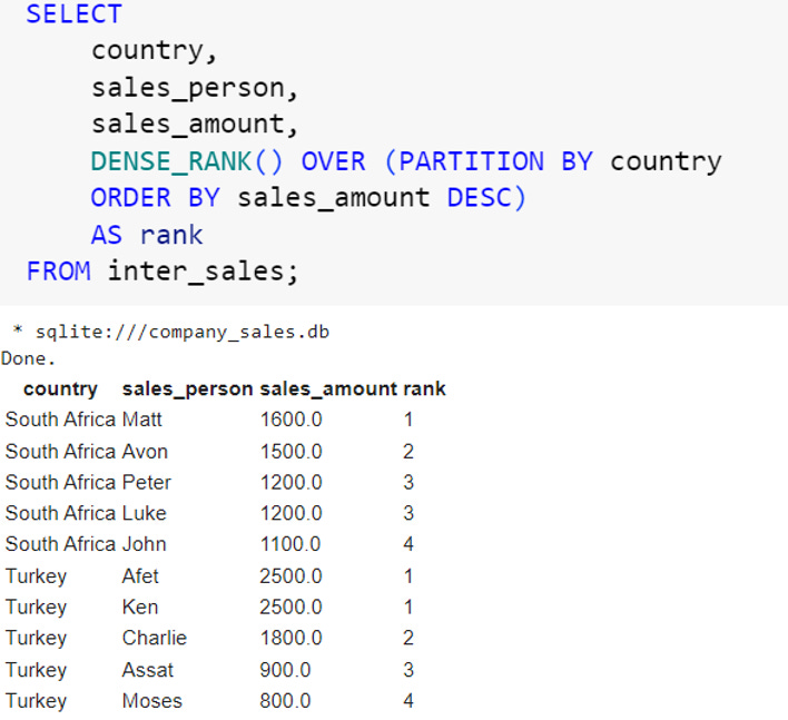 So far, when creating ranks, we have treated the whole dataset as one group. However, we can also divide the dataset into subsets of partitions and rank the data in each partition. Let’s look at a practical example. We want to know who the top salesperson is per country. If there is a tie, we want both sellers to be retrieved, and we don’t want gaps in the ranking. We can partition the data by country (that is, create two subsets, one for sellers in South Africa and another for sellers in Turkey) and rank the seller in each partition by the sales amount using DENSE_RANK(). See below: