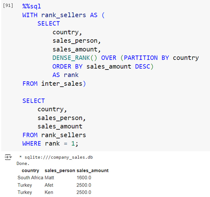 You can see below that we have partitioned the data by country. We now have a ranking for sellers in South Africa and a ranking for sellers in Turkey. We can easily see who the top sellers are in each country. Since we are using DENSE_RANK(), sellers who are tied in each country have been given the same rank (Afet and Ken in Turkey), and there are no gaps in the ranks. To retrieve the names of the top sellers, we can convert the above query into a Common Table Expression (CTE) and then query it using the main query. See below: