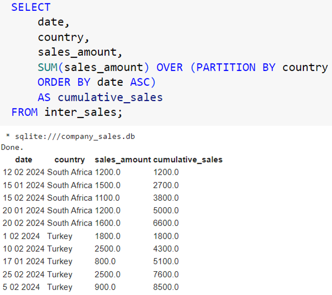 In this query, we partition the data into subsets (partitions) based on country. The cumulative sum is calculated separately for each country. The SUM() function accumulates the sales_amount over time, giving the running total of sales per country. Within each partition (country), the sales data is ordered by the date column in ascending order. The cumulative sum is calculated in this order. This type of query can be useful for tracking sales growth over time for each country, providing insights into country-specific sales trends.