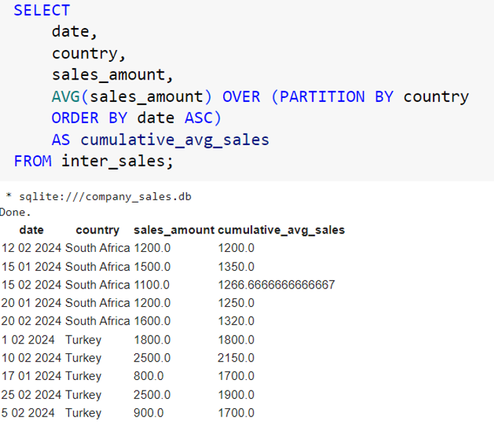 We can do similar things with the AVG function. We can use it as a window function to calculate the cumulative average of sales over time for each country.